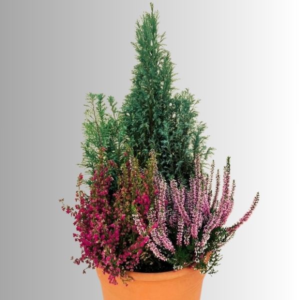 A bevezető képen, illetve az alábbi képen törpe Chamaecyparisok vannak beültetve egy Erica gracilis-szel és egy Calluna vulgaris-szal (csarab). Ez az egy erica a kivétel, amely már most is virágzik, elvileg a többiek ugyanis télen virágoznak, mikor a csarab már elvirágzott. Ezek viszont remekül mutatnak így együtt. Apró szépséghiba, hogy ezt az ősszel virágzó Erica-t (Erica gracilis) teleltetni kell, mert nem bírja a fagyokat.