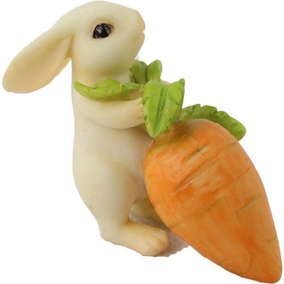 Az állatok még varázslatosabbá teszik a tündérkertet, hát még egy ilyen dolgos nyuszi! A nyuszi éppen egy répát húz ki a földből.