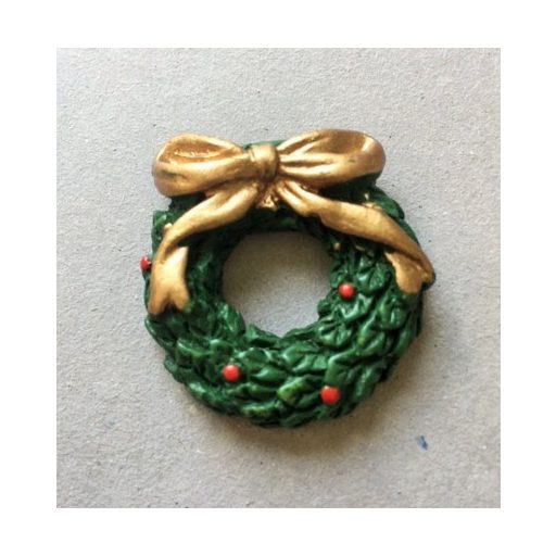 Apró, felragasztható karácsonyi koszorú, arany színű masnival. Mérete: 3 cm.