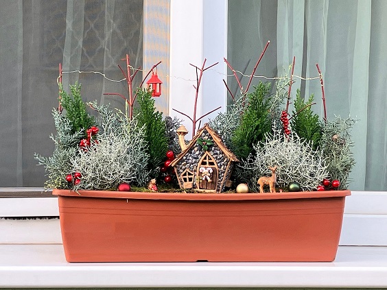 Én egy kis erdei világot álmodtam az ablakba. A kisméretű örökzöldek (Chamaecyparis lawsoniana 'Elwoodii' elé ezüstszínű párnacserjéket (Calocephalus brownii) ültettem. A köztes helyekre borókaágakat és piros vesszejű somot szúrtam. A vékony drótocska a vesszők végén egy ledfüzér, hogy hangulatvilágítás is legyen. Pici gombákkal, néhány betűzhető karácsonyi gömbbel színesítettem. A házikó az egyik kedvencem a Fiddlehead termékekből. Ajtaja nyitható és belülre is tehető mécses. Így éjszaka tényleg olyan, mintha tündérek laknák.Tény, hogy a párnacserjék nem annyira szeretik a mínuszokat, viszont az ablakon kiáradó hő, illetve a pesti nem túl hideg miatt, nálunk ez is kint maradhat.